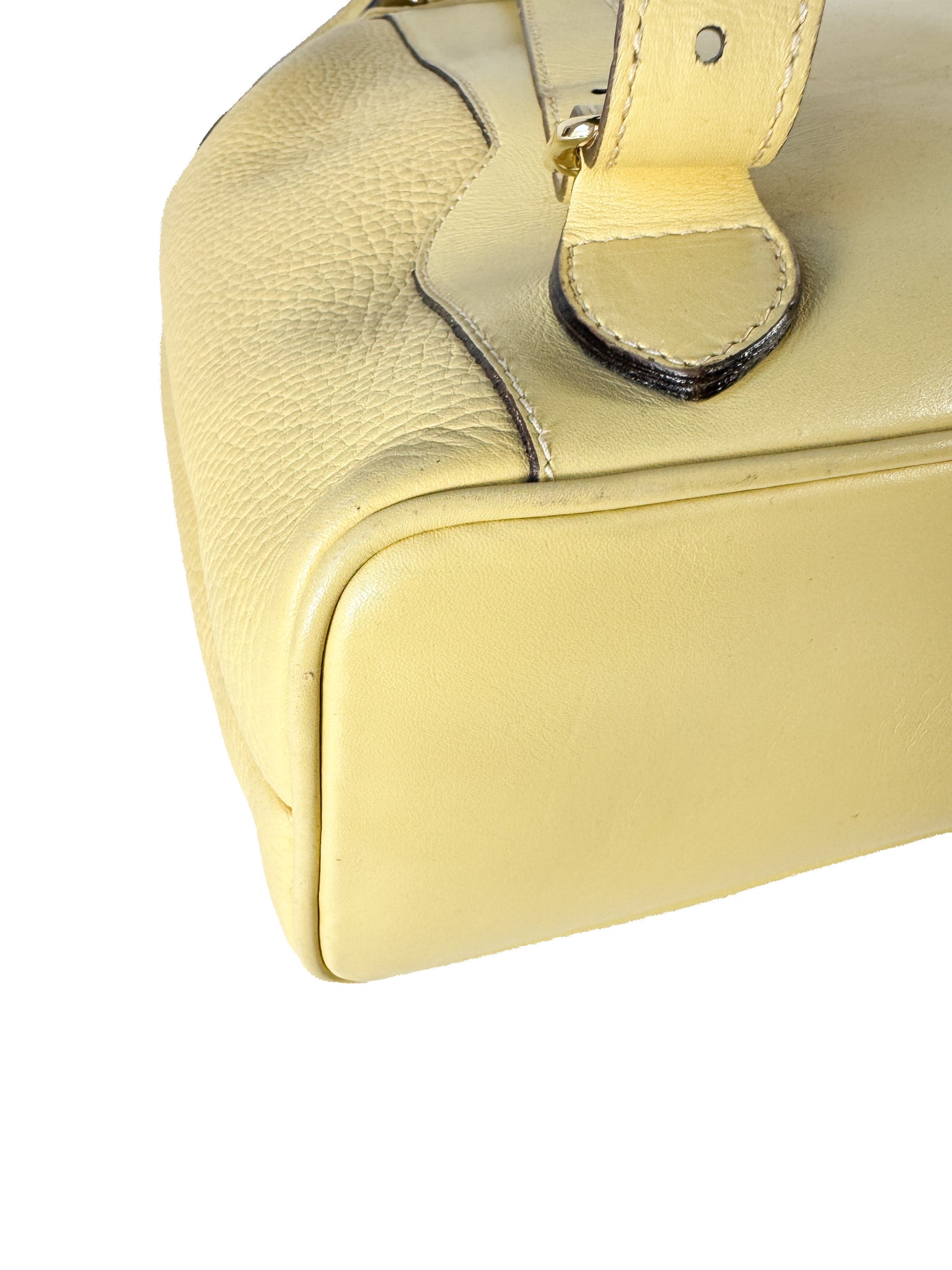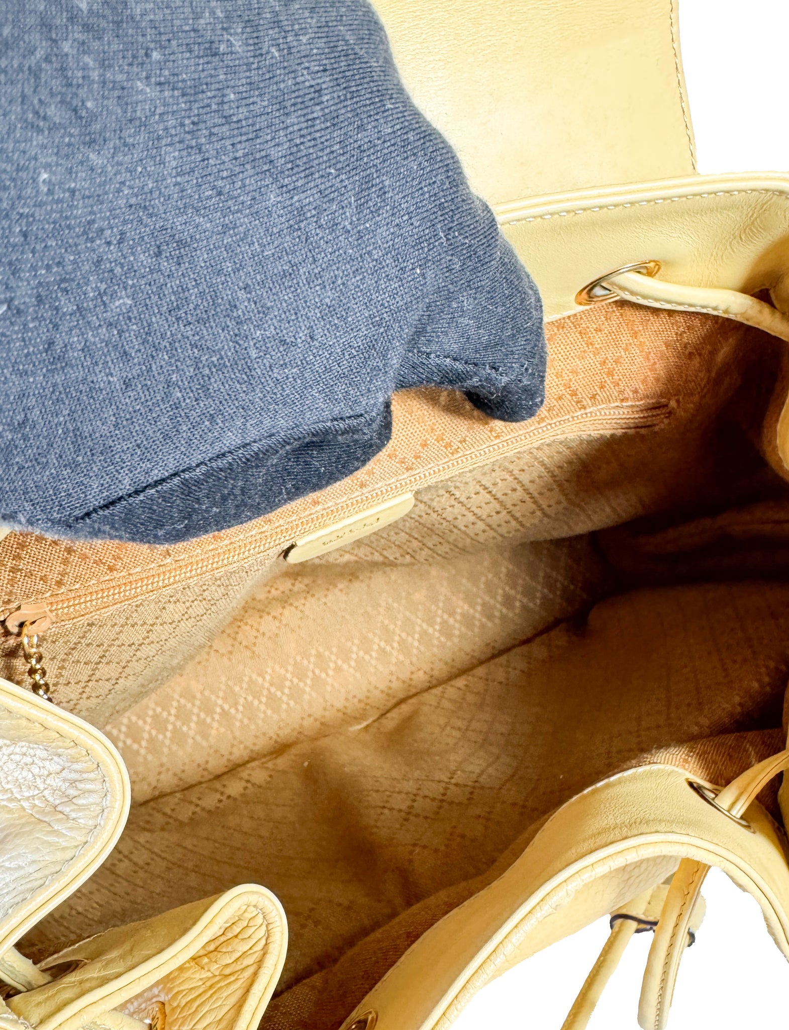 Condition: 7.5/10. This vintage backpack is the prettiest shade of leather. There is wear throughout the backpack with small dots of discoloration, it is the most noticeable on the straps. There is some color transfer on the back of the backpack from the strap edging. The corners and interior are in great condition.