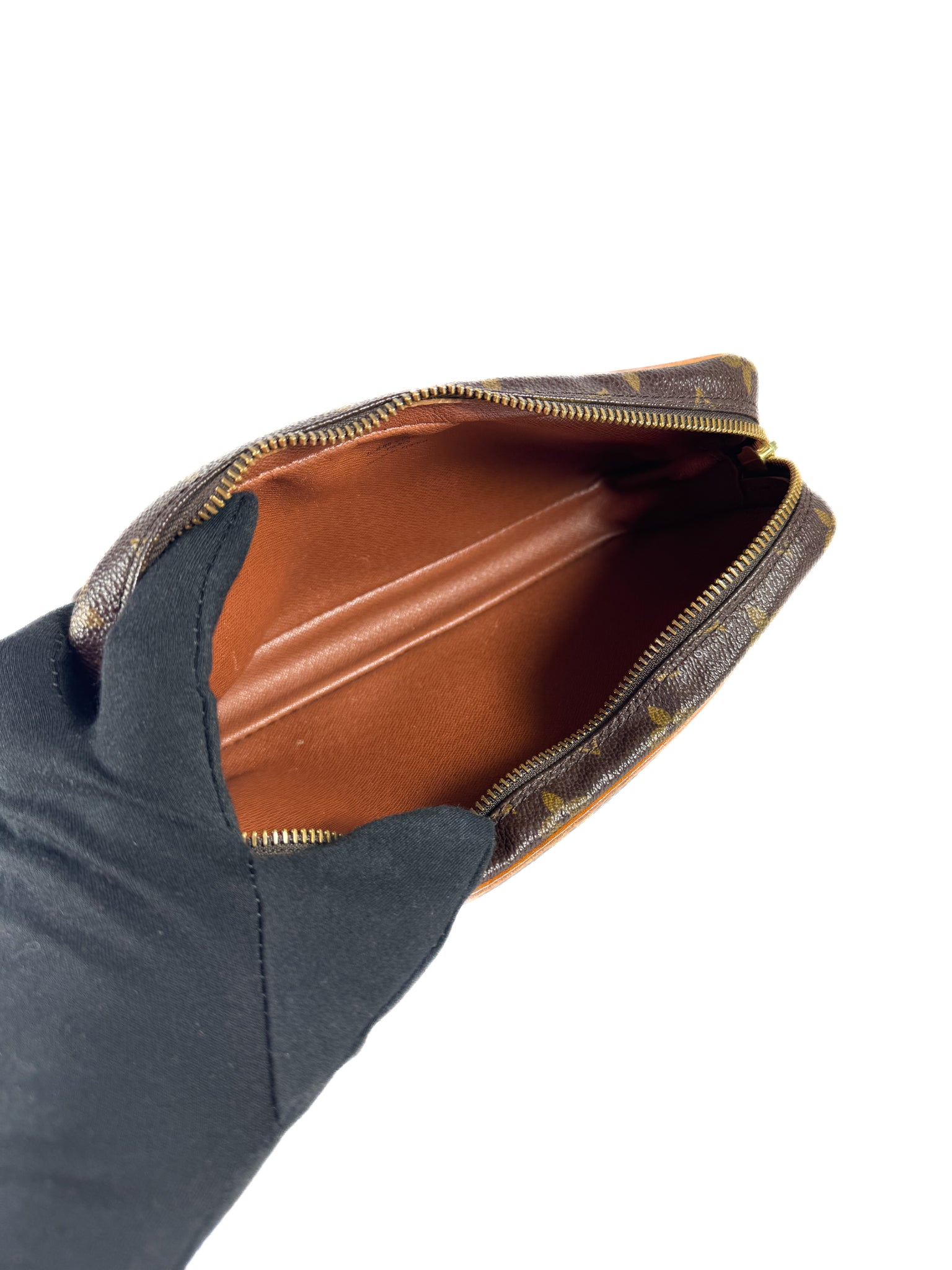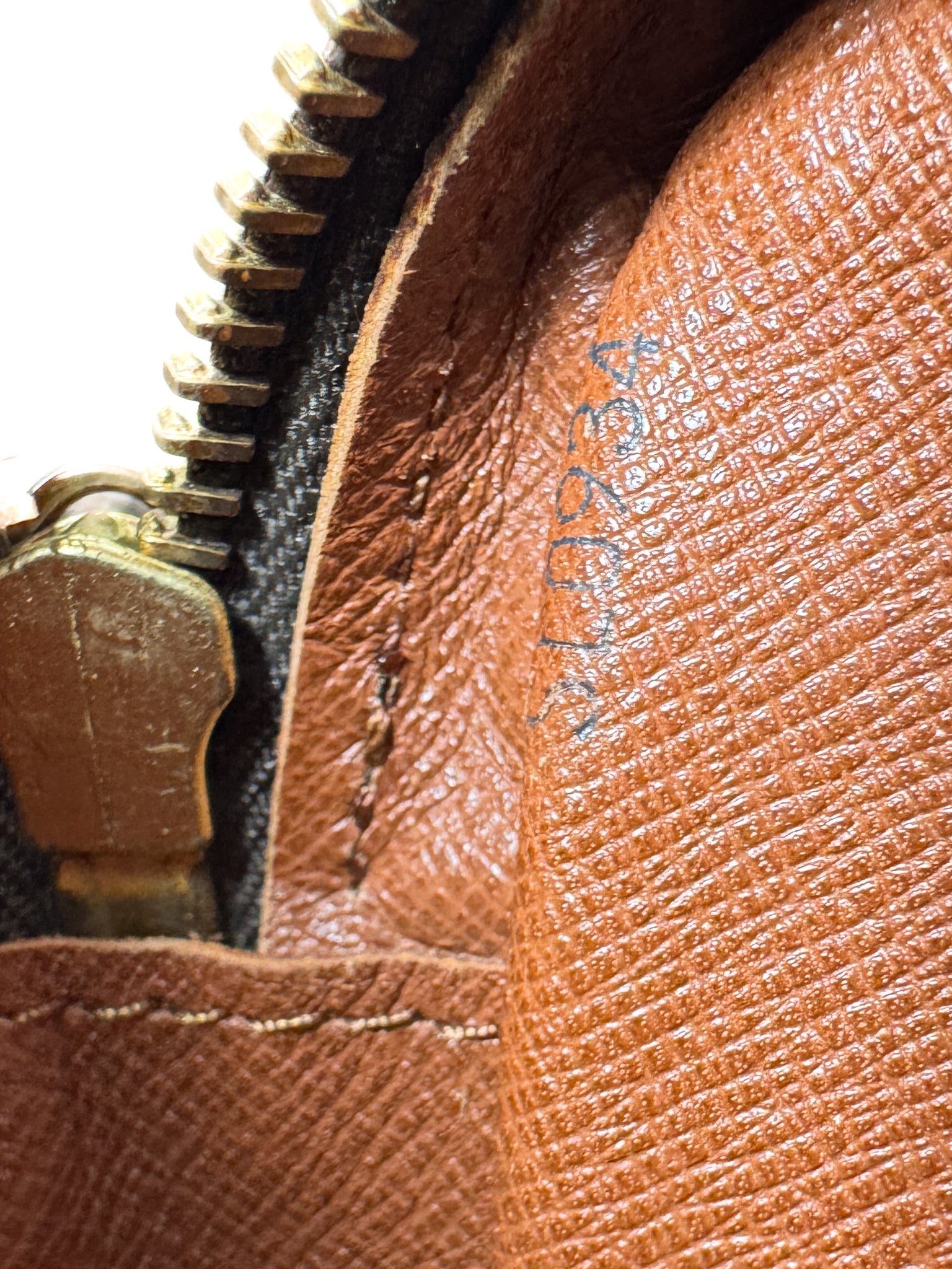 Condition: 8/10. This great vintage piece is from 1994 and in good condition. The leather trim has patina, discoloration, and the trim near the strap has some cracking. The coated canvas is in great condition along with the leather interior.