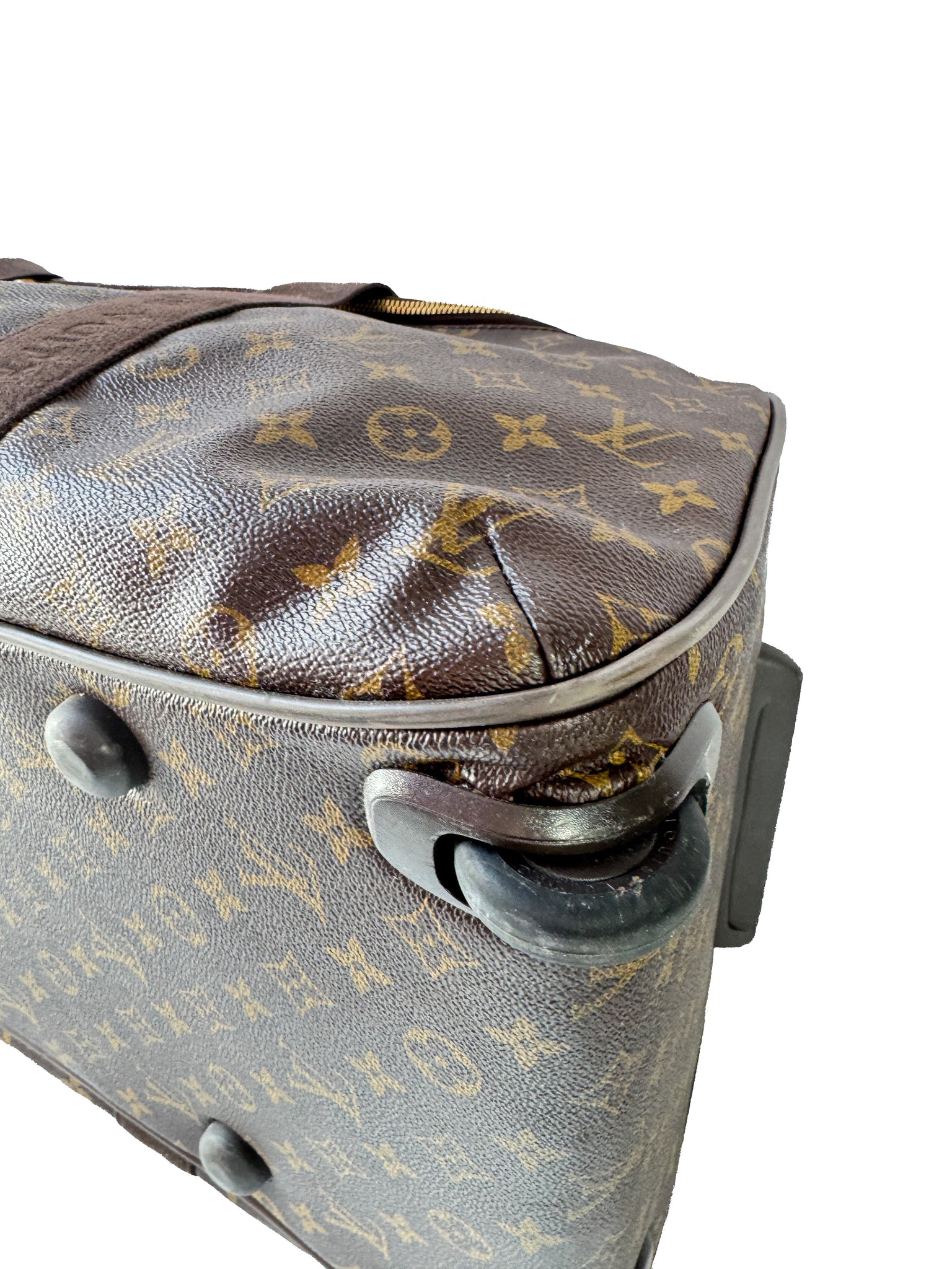 Condition: 7.8/10. This great piece of luggage from 2016 will make travel just a bit easier. Two wheels and a collapsible handle will help when you're in a rush. The straps are nice and long, with a leather piece in the middle to keep them together. There is a small canvas crack near the one wheel. The interior is in excellent condition. Comes with lock, no key.