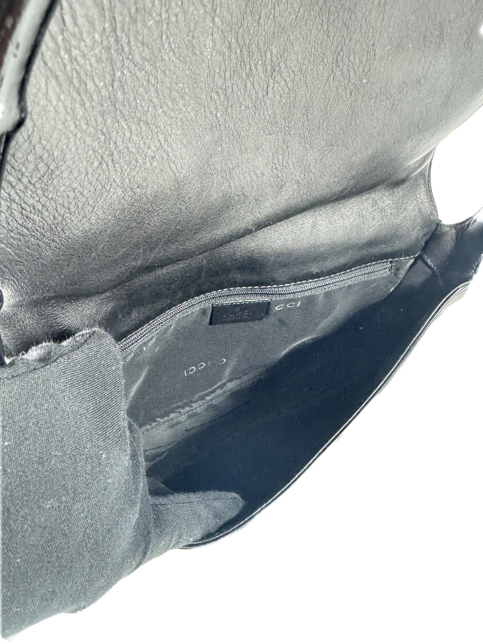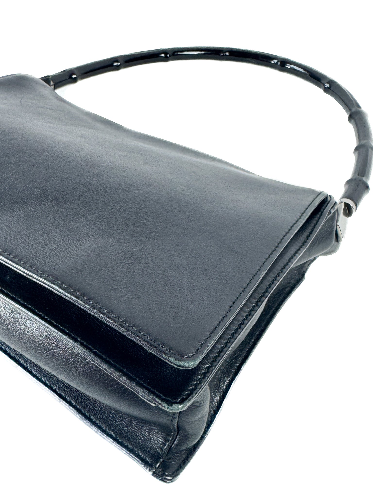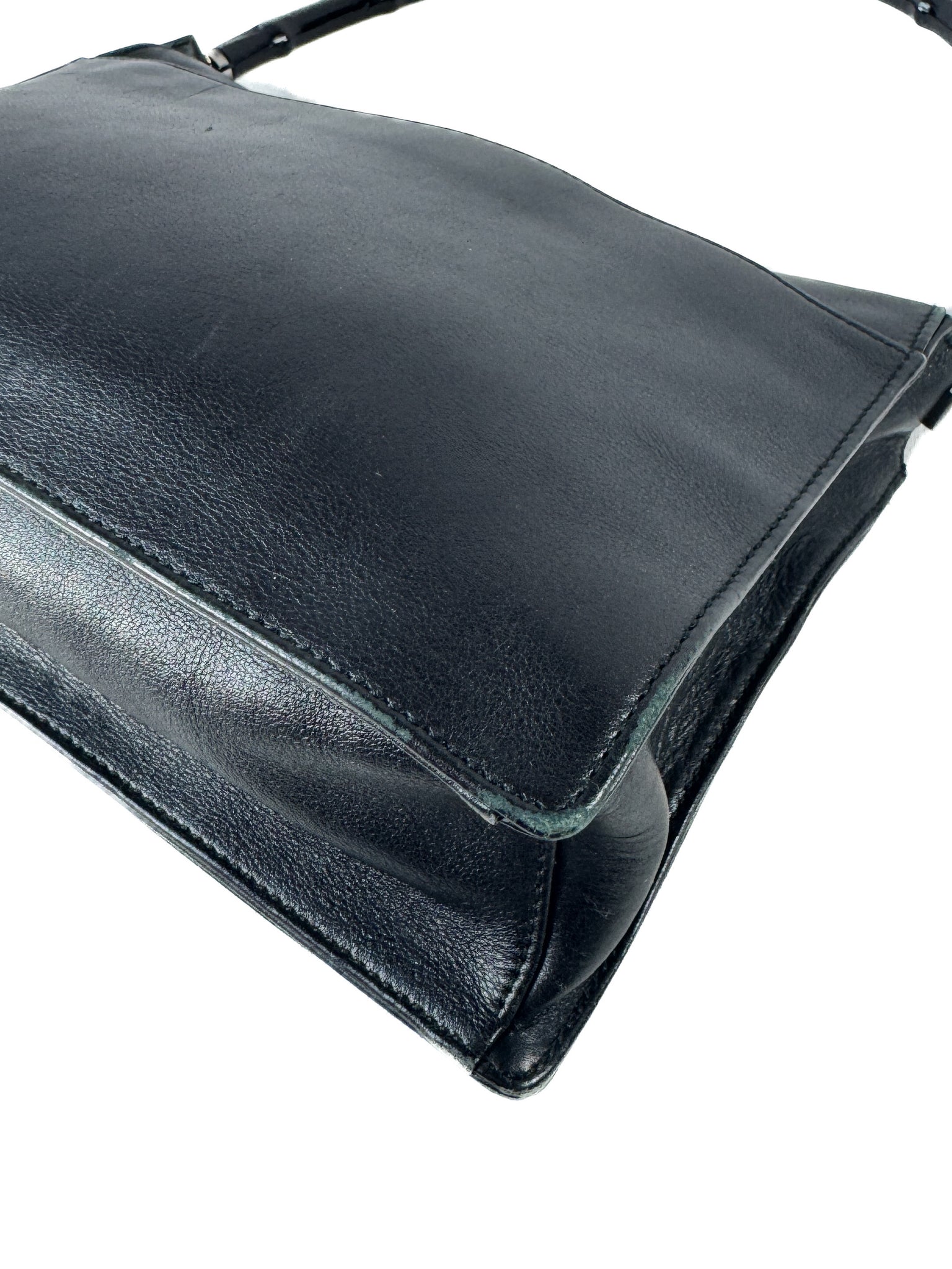 Condition: 8/10. This great vintage leather flap bag has some signs of wear at the corners via slight rubbing. There is some slight scratching throughout the leather exterior. The bamboo handle is in great condition. The interior is in great condition.