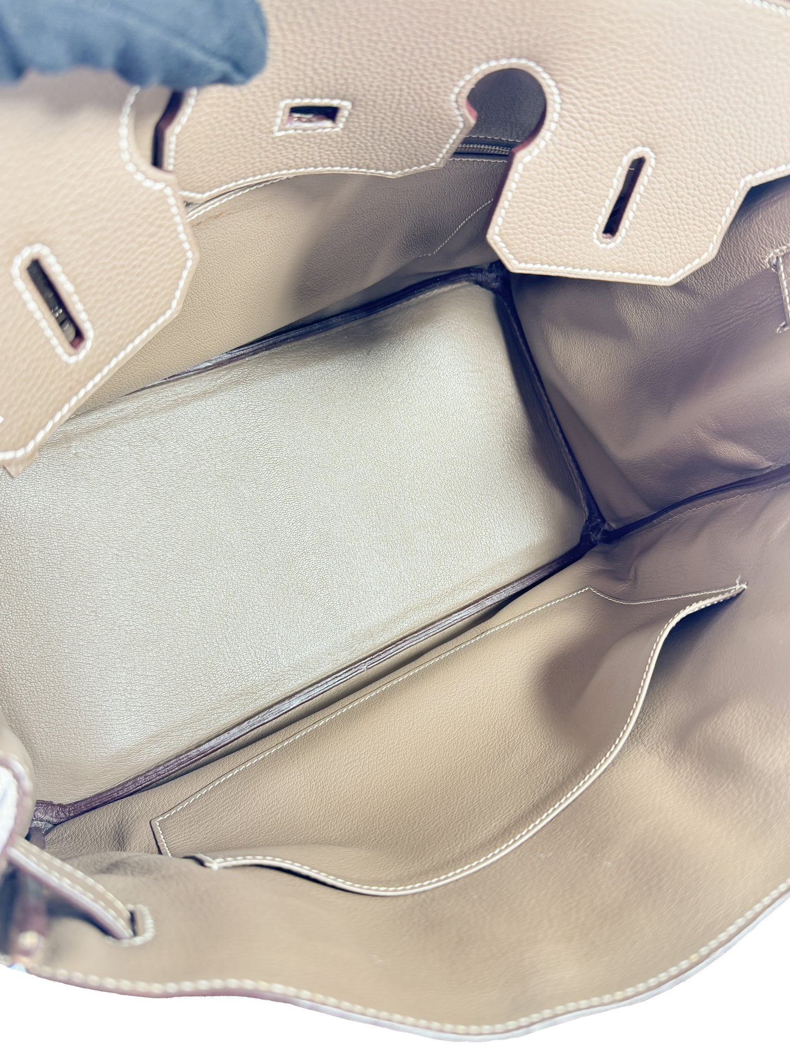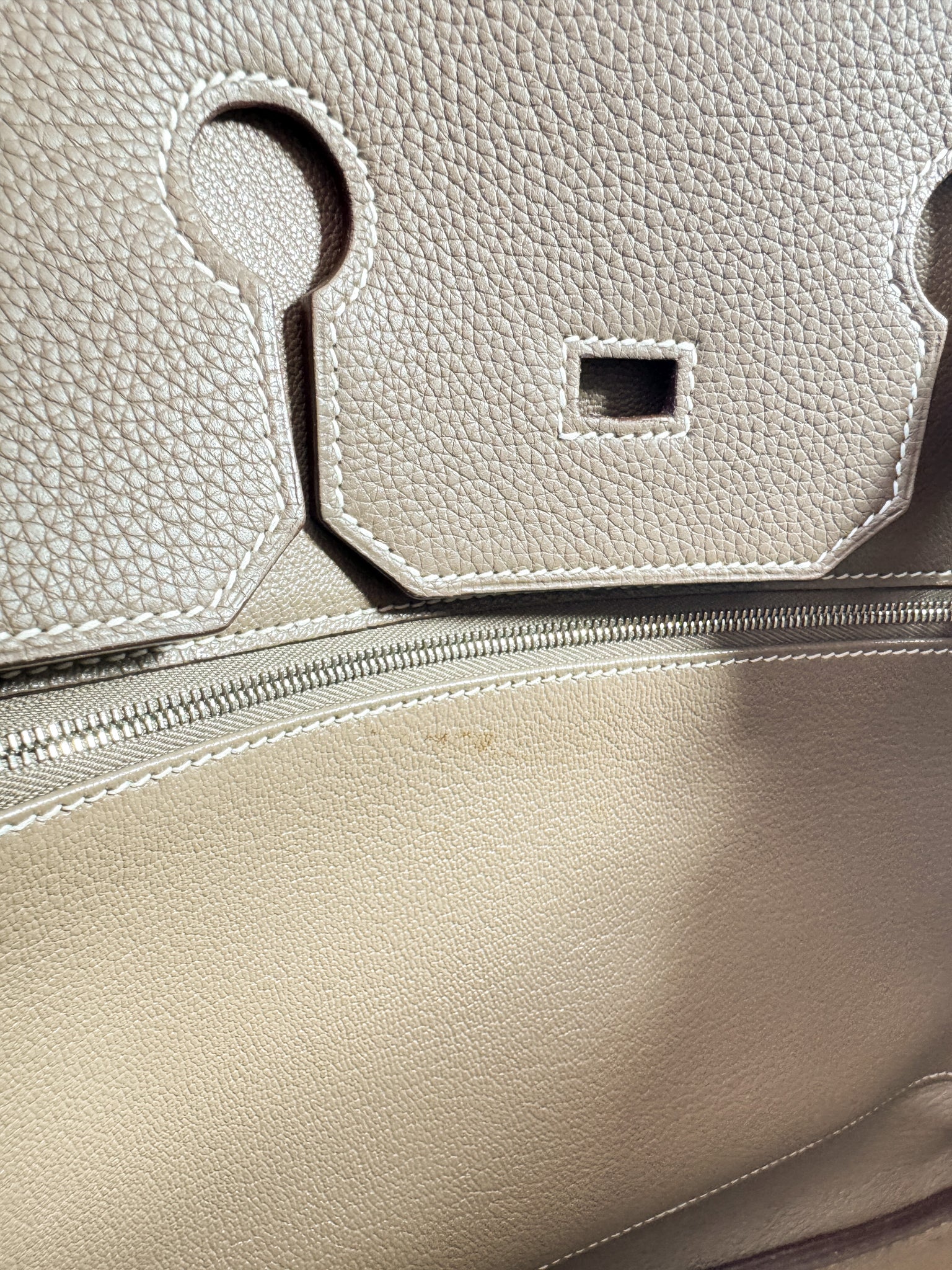 Condition: 9/10. This stunning iconic bag is in a great neutural color that is known to shift shades depending on the lighting. This Birkin is from 2007. There are some signs of wear on the corners and a few other tiny spots throughout. Hardware has light scratching. Interior has very light discoloration. This bag does come with box, clochette, lock & keys, rain coat and dust bag. Box has damage.