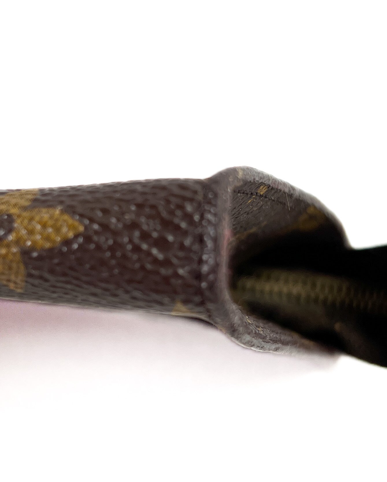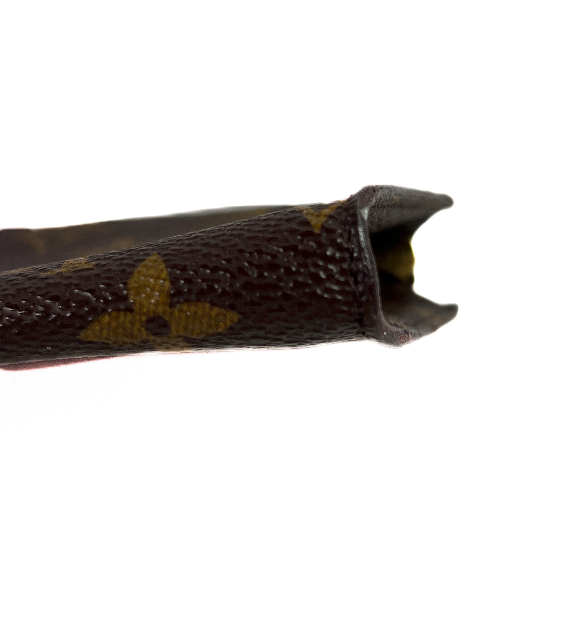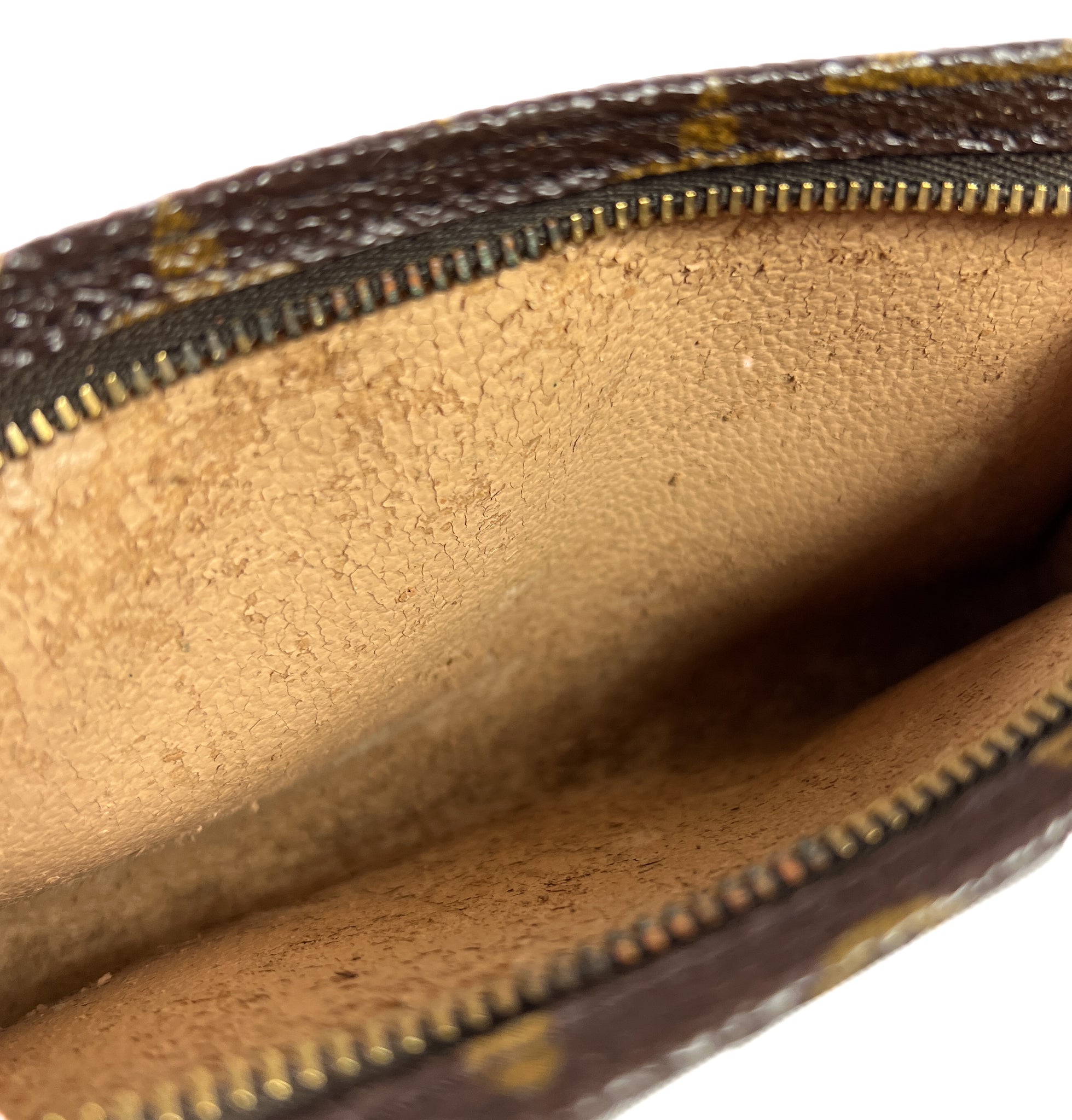 Condition: 6/10. This great zip pouch can be used for so many purposes. The smaller size makes it great for most bags! The exterior is in great condition with some signs of wear to the edging and zipper discoloration. The interior has started to peel, which is typical in older pieces. The interior can be shaved or replaced. The sticky interior has caused the zipper to be a bit sticky when being used but this can be cleaned. This item is priced as is.