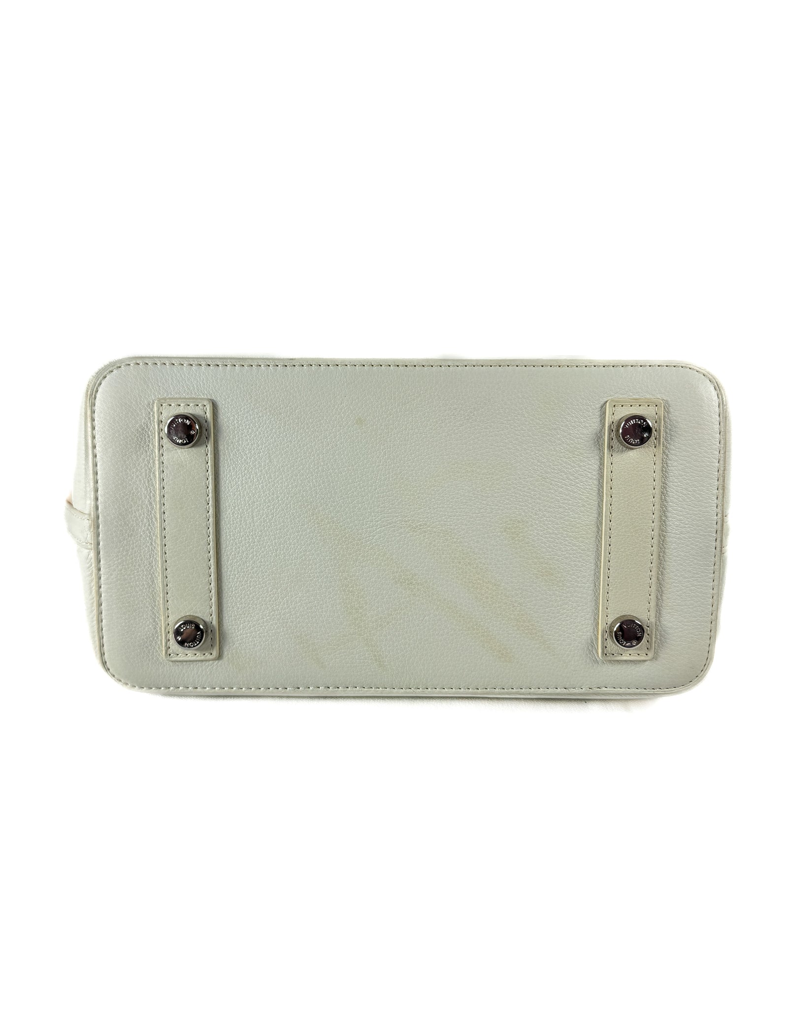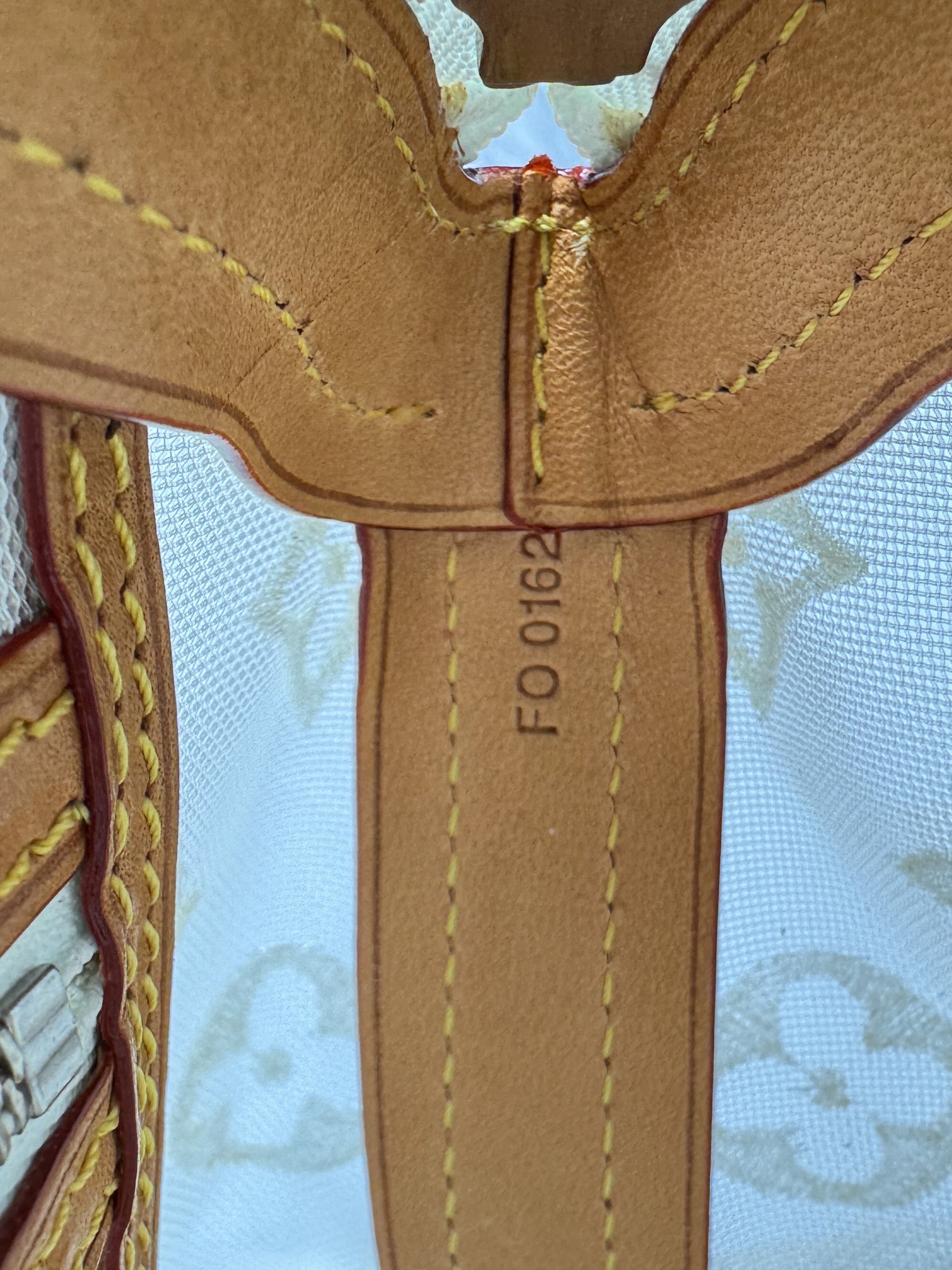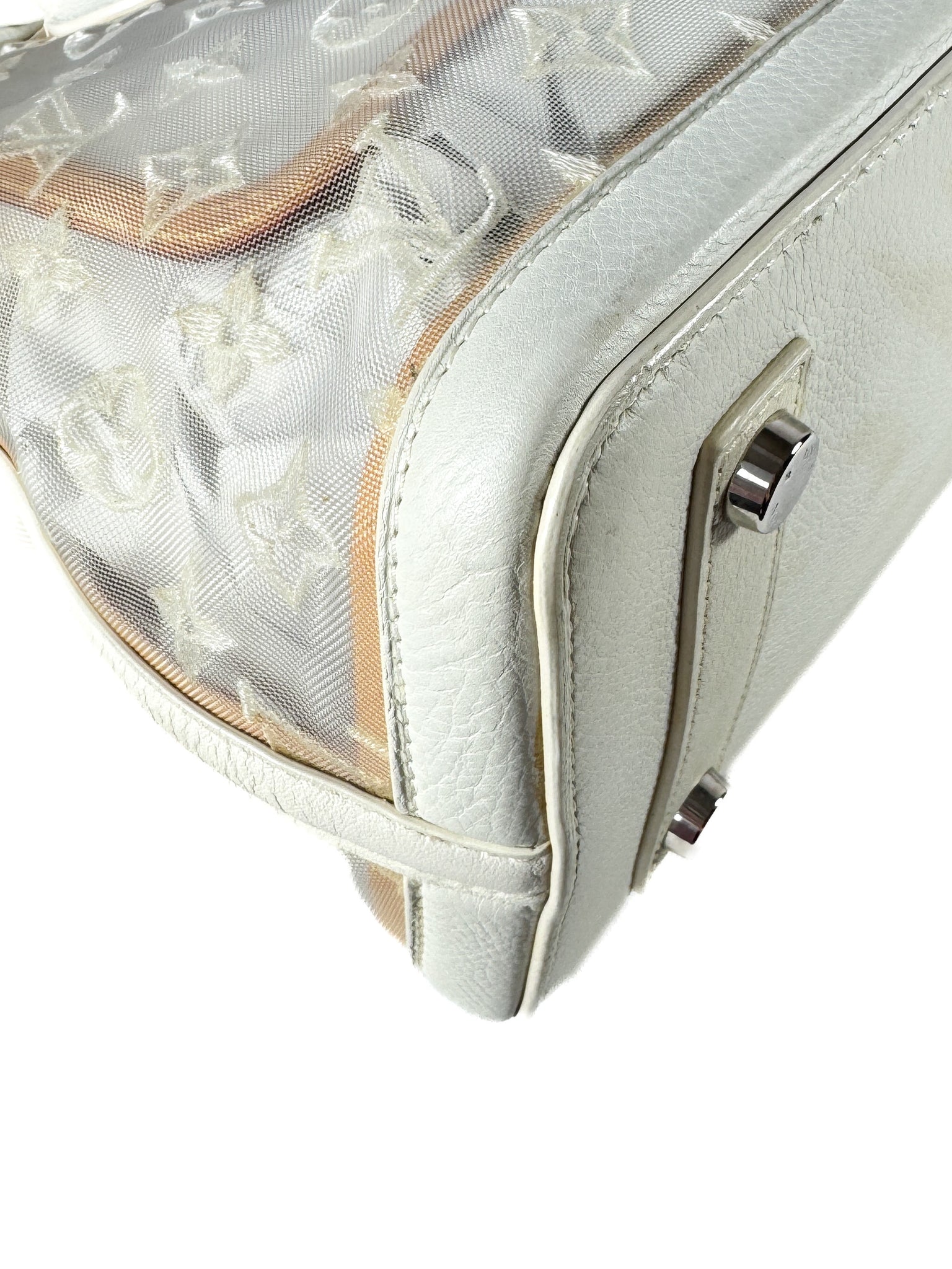 Condition: 7/10. This really fun bag is from 2012 and not one you see often. There are signs of wear on the white leather, heavier on the handles (discoloration), rubbing at the corners, and discoloration on the bottom both inside and out. There is a small area on the mesh with some light discoloration.