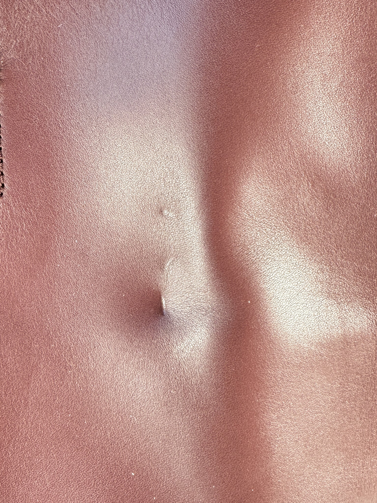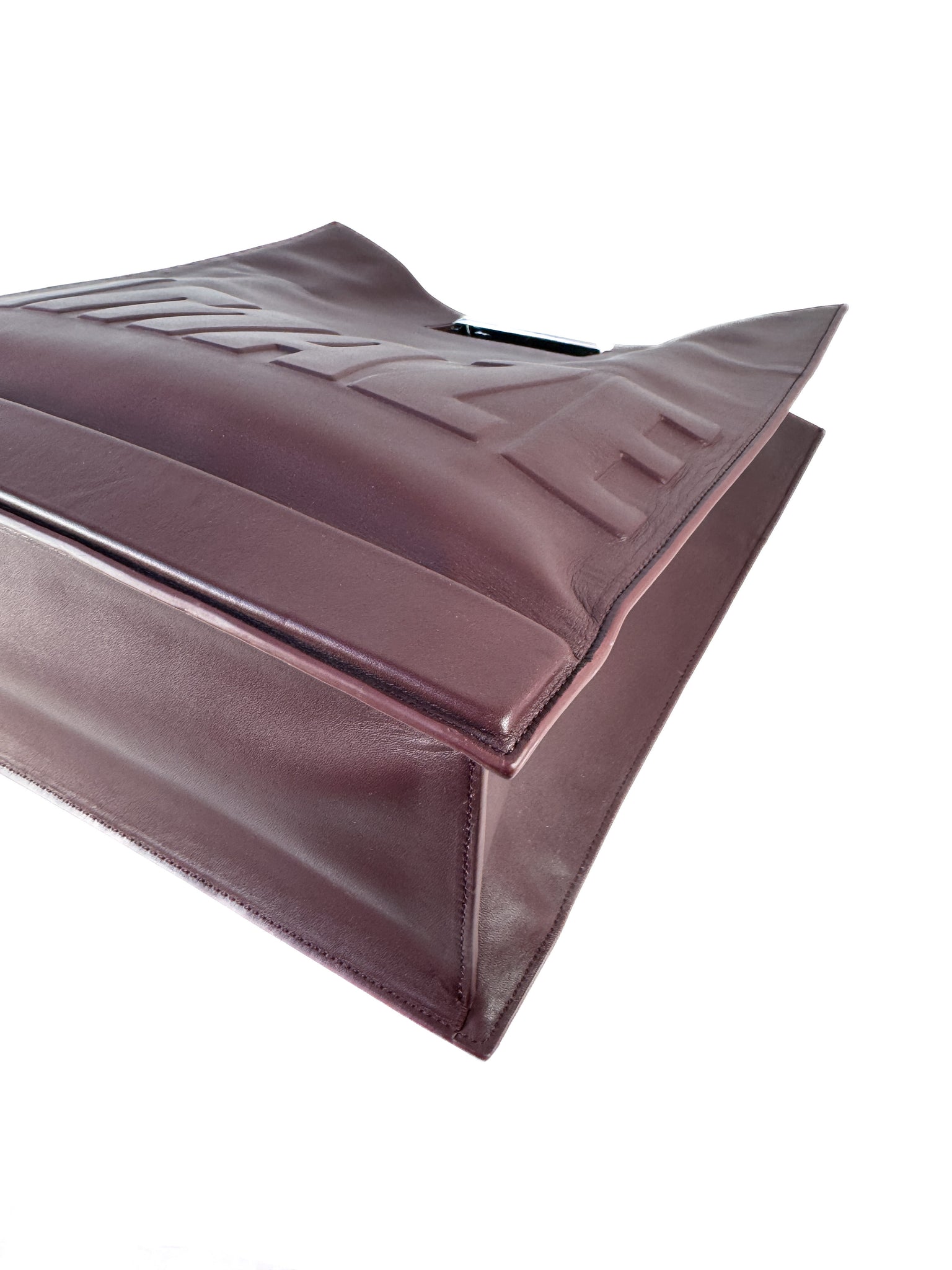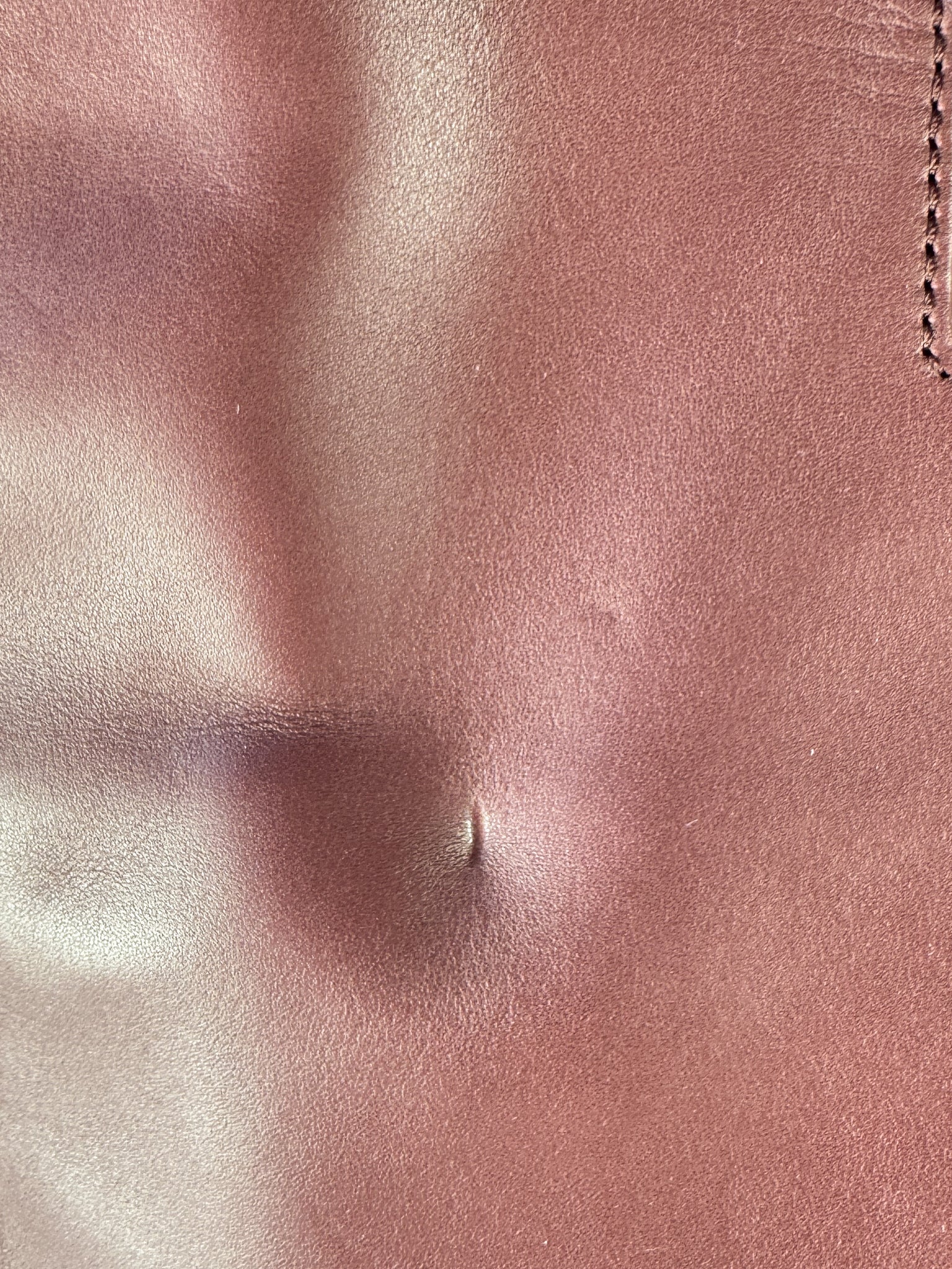 Condition: 9/10. This fun tote has some signs of wear via two small indents on the back. The metal trim on the cut out handle still has the protective wrap on it. The interior has very light discoloration.