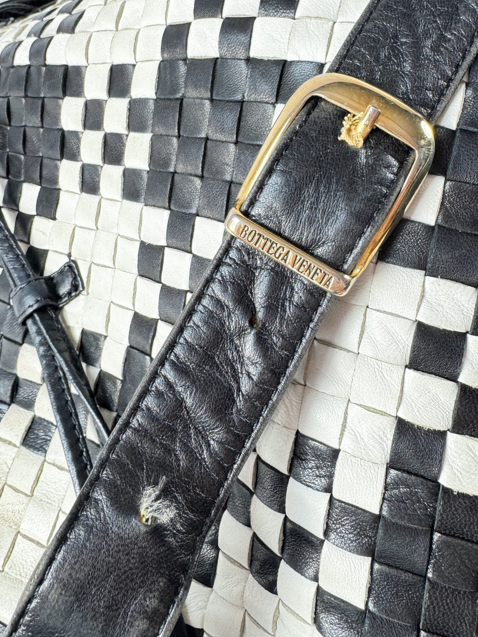 Condition: 7.5/10. This really cool vintage bag is in good condition but does have some noticeable signs of wear. There is some wear on the strap near the buckle holes, and there is some rubbing that is on some of the white areas on the body of the bag. The corners are in good condition, and the interior of the bag is in great condition.