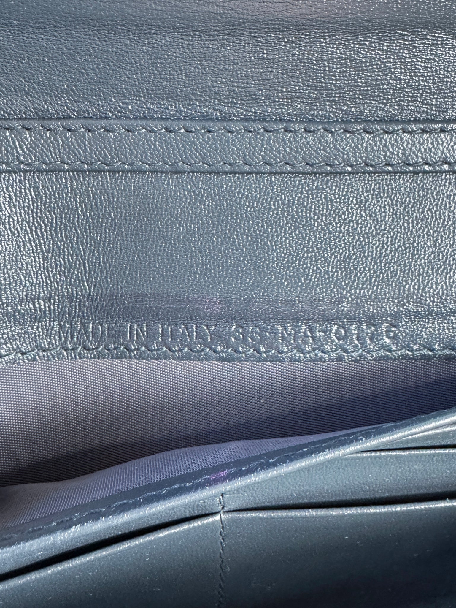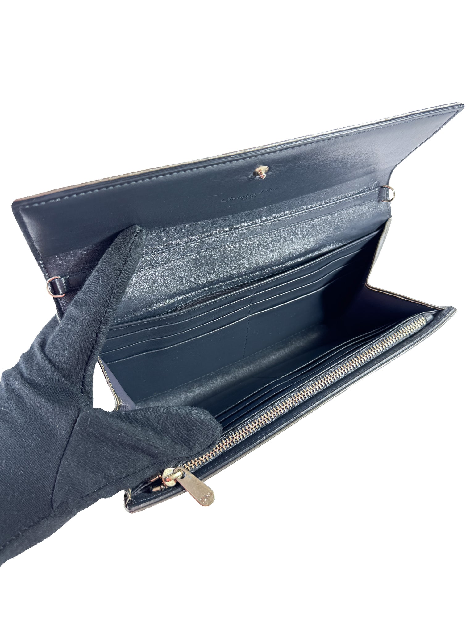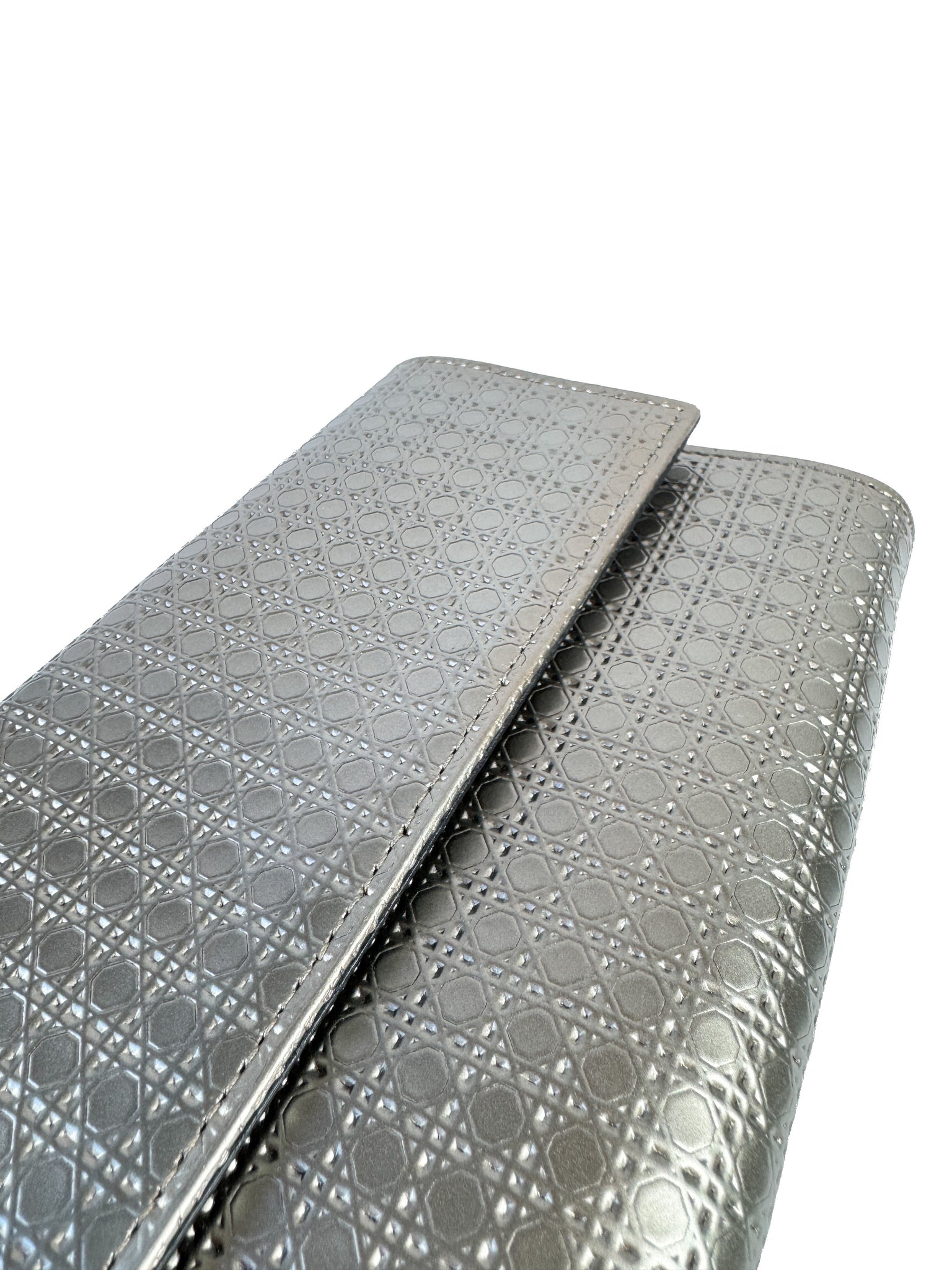 Condition: 7.5/10. This wallet on chain overall is in good condition. There is some light bronze toned discoloration along the edges, especially on the flap. The interior has some scratches. The snap annd strap rings are gold, while the Dior charm is silver. It is missing the original chain strap but a dark silver generic chain strap is included. It does come with box.