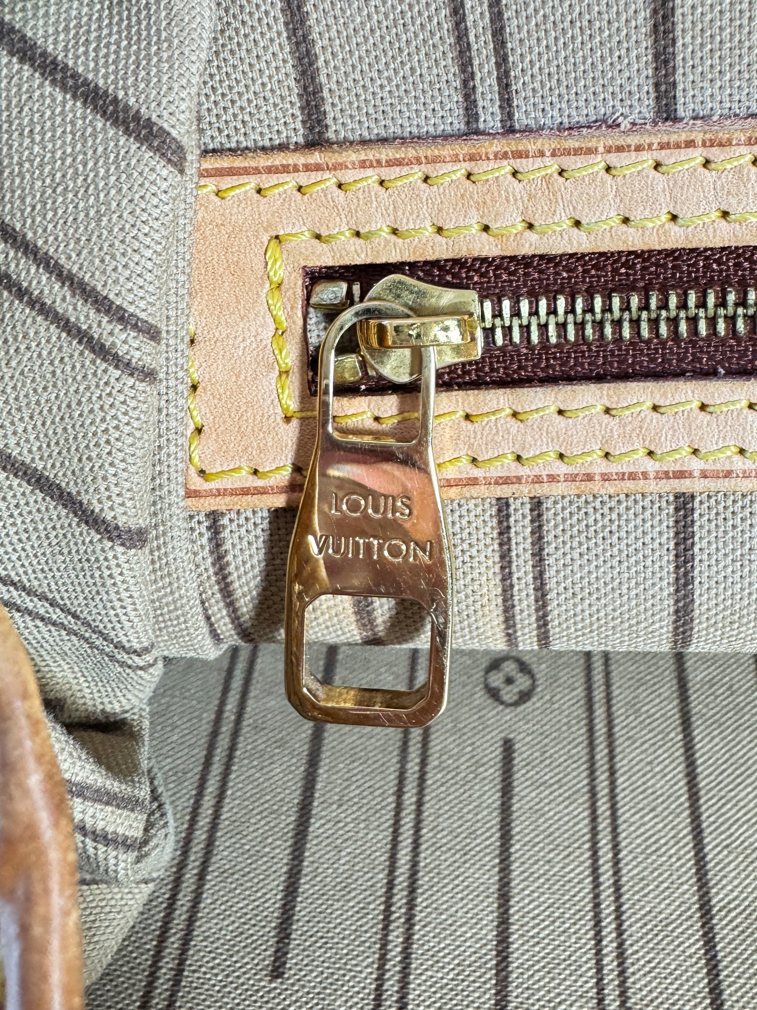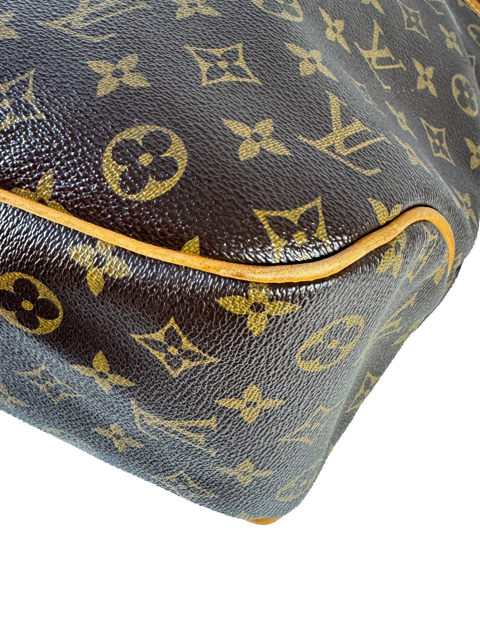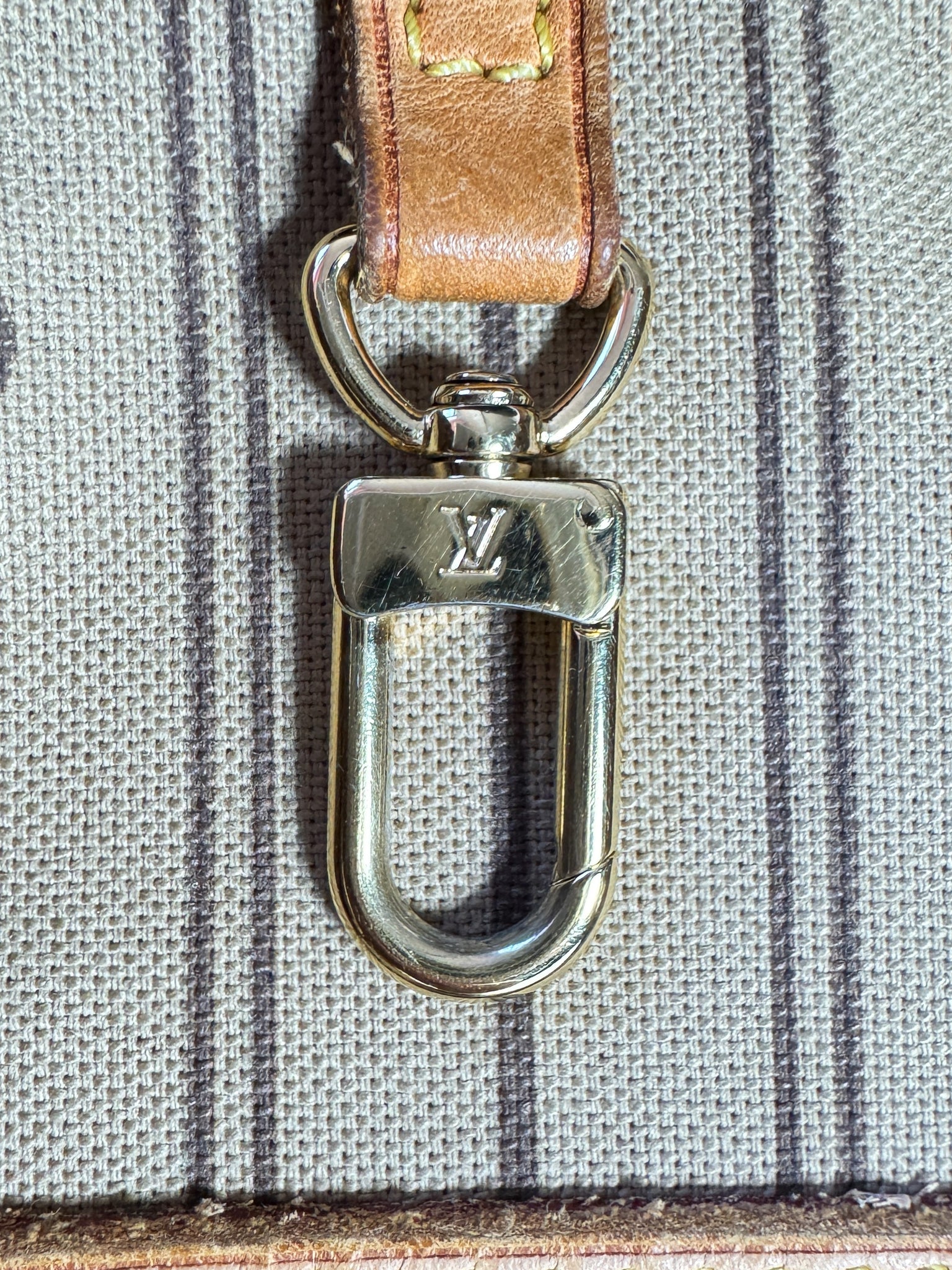 Condition: 8/10. This classic style is from 2011 and in good condition. There is normal patina and discoloration on the leather trim and hardware. There is light interior discoloration. There is a very tiny crack on the canvas near the front leather logo patch.
